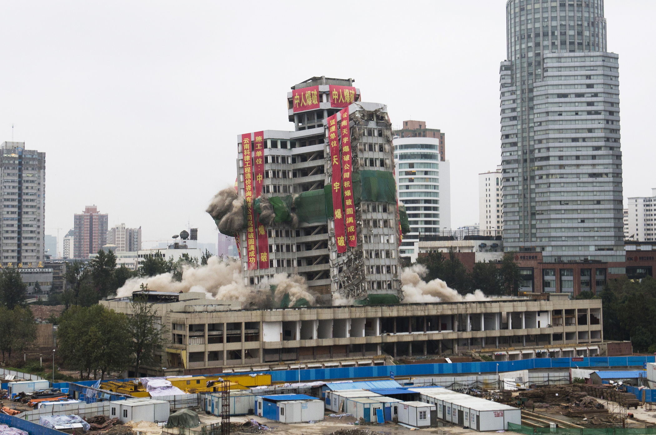 2013年9月7日上午7时,昆明市工人文化宫成功实施爆破拆除。昆明市工人文化宫于1985年建成投入使用,是当时云南最高的建筑物,也是上世纪八九十年代昆明的地标式建筑。刘建明摄