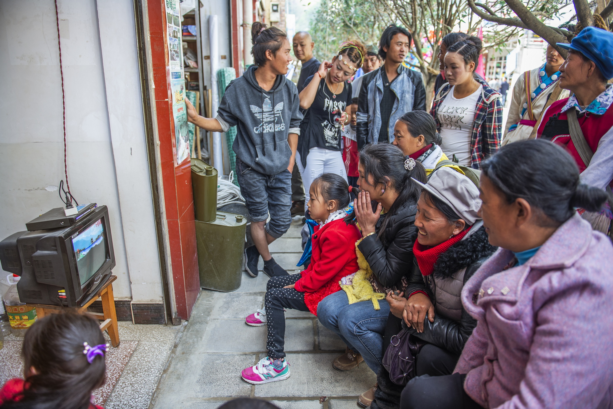 2015年,维西县叶枝镇的赶街天,傈僳族群众围聚在小商店门口,观看DVD播放的影视节目。刘建明摄