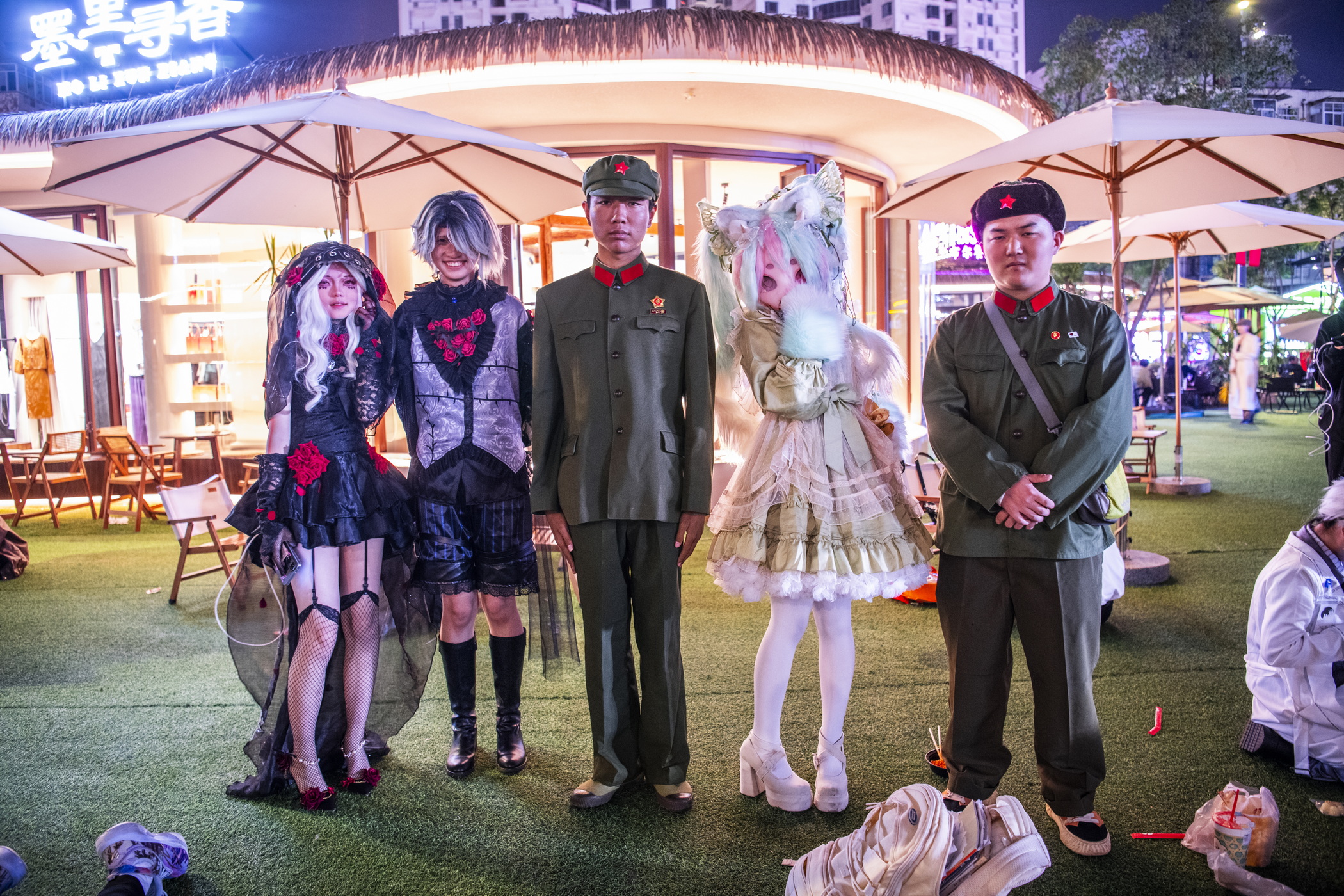 2024年,参加首届昆明夜酒文化节活动的青年,既追求动漫时尚,又祟尚早年的解放军军装,构成了不同年代,不同类型服装的有趣组合。刘建明摄
