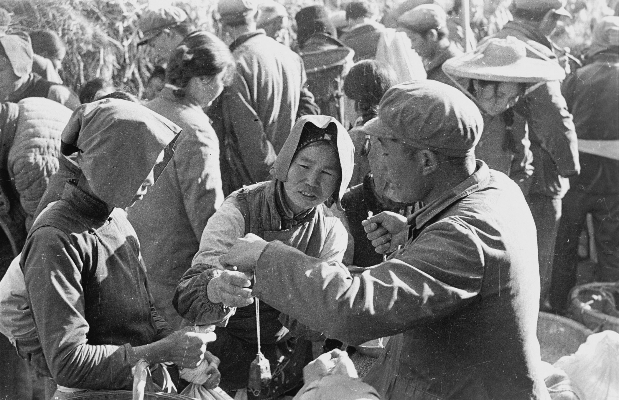 1979年,昆明小板桥乡街子上,一位农妇讲价还价后仔细察看杆秤的斤两。刘建明摄
