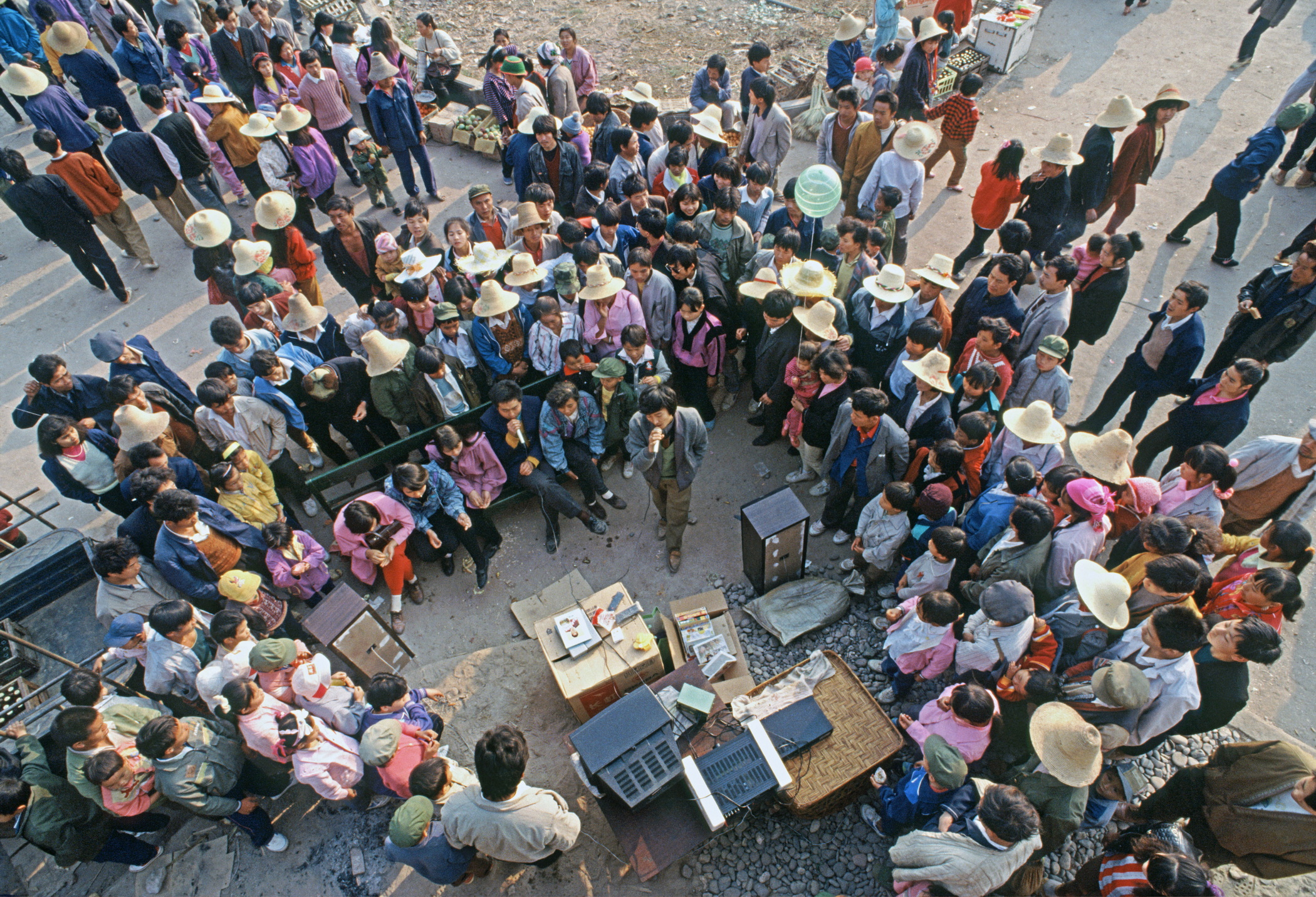 1991年,新平县漠沙乡集市上的卡拉OK摊点十分火爆,K歌者争先恐后,围观者难以计数。刘建明摄