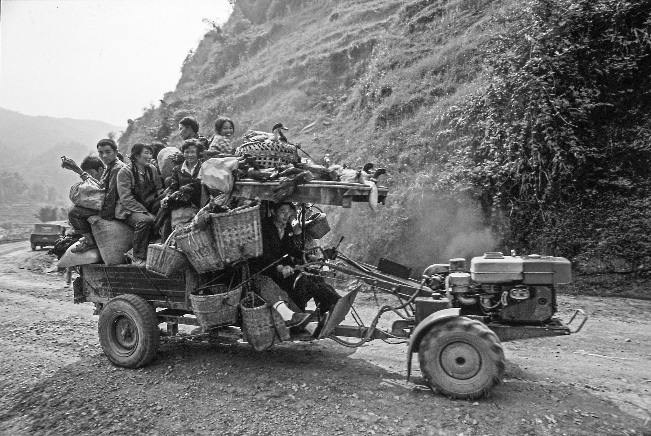 1992年,大姚县崎岖山道上,滿载老乡和货物的手扶拖拉机前去龙街乡赶街。刘建明摄