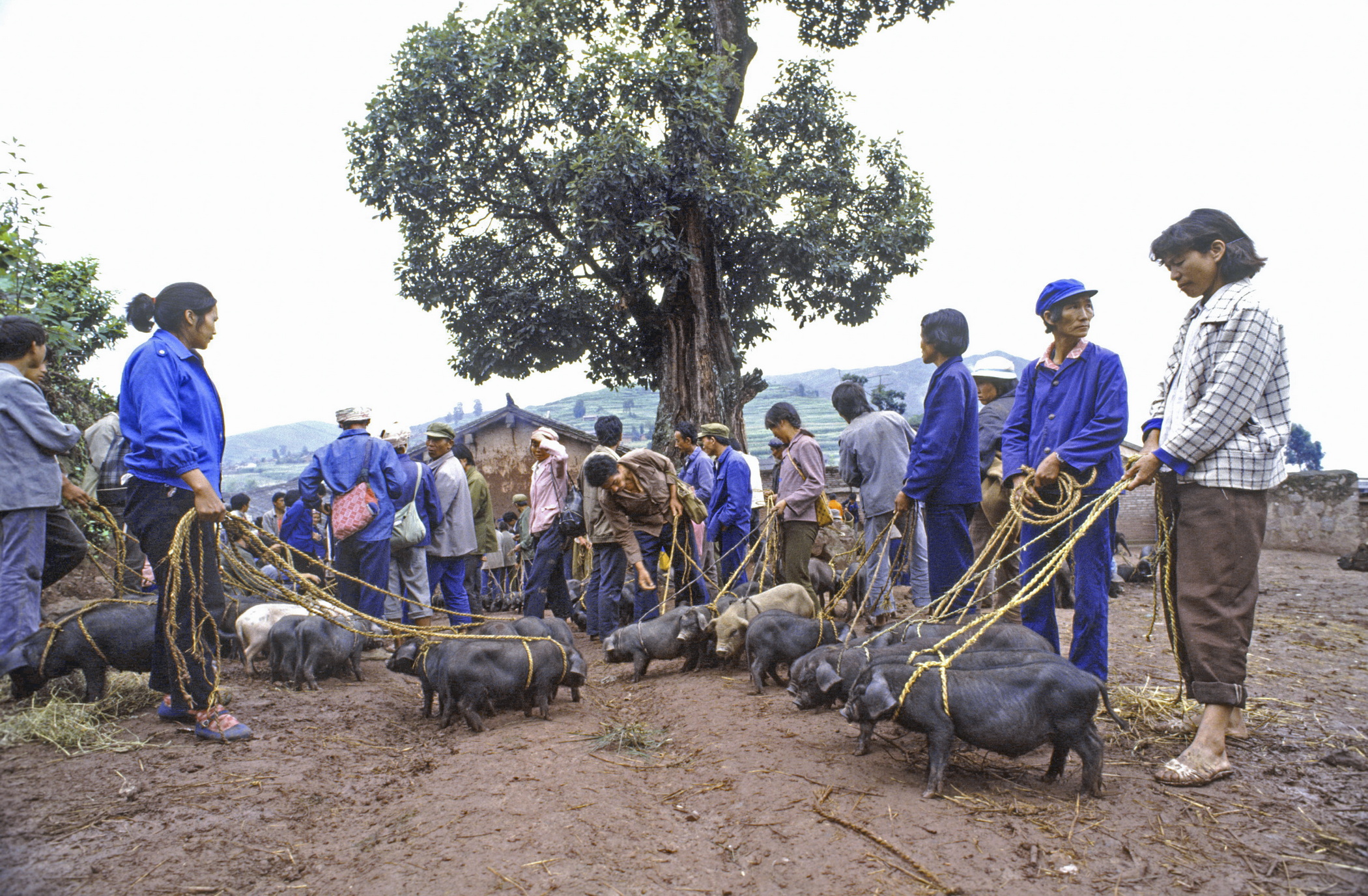 1993年,双柏县乡街子上的云南特色,“仔猪栓着卖”。刘建明摄