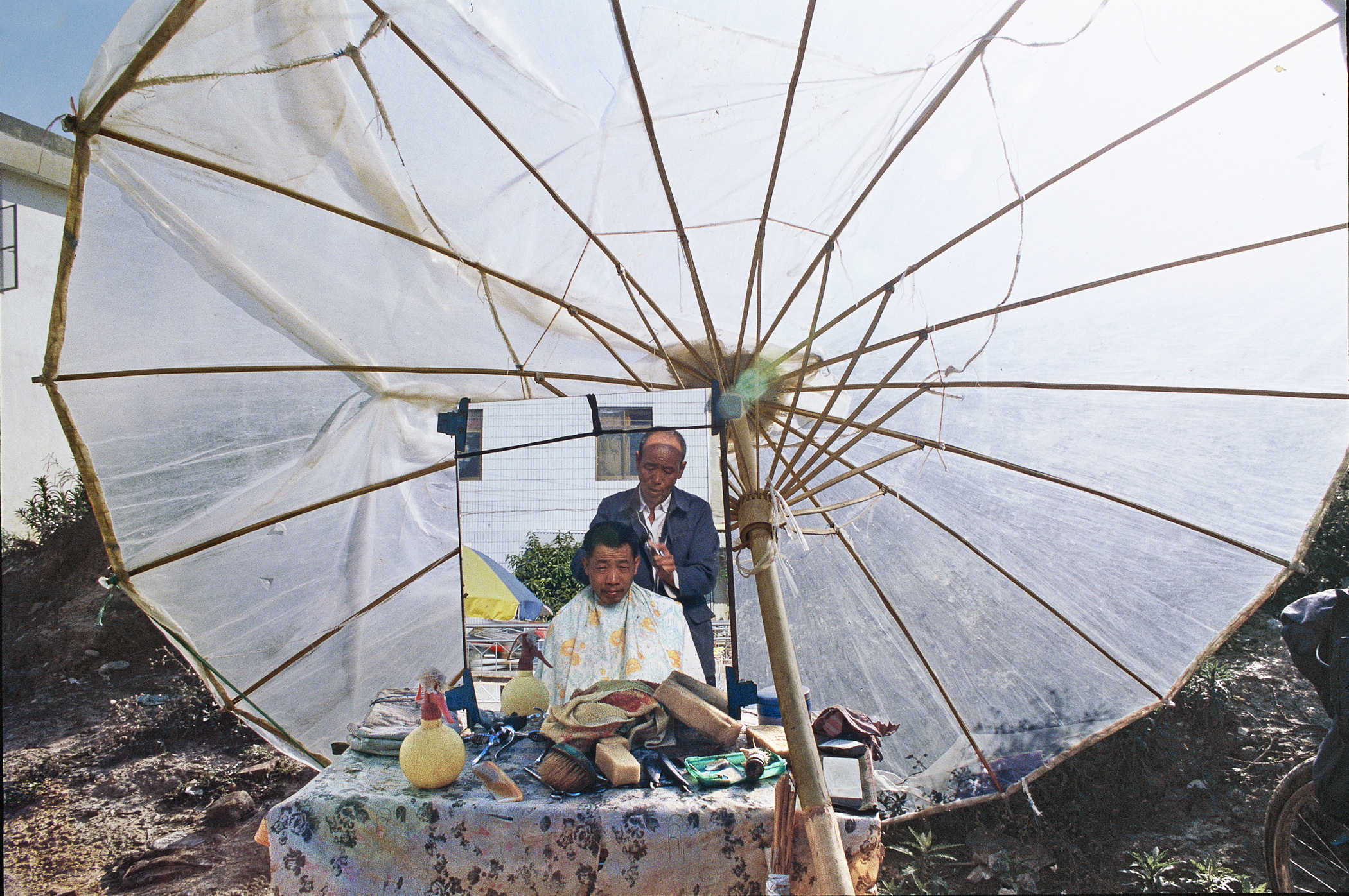 1994年,芒市农村赶街天,遮阳挡风的大白伞下,理发摊上的镜子映现出理发师和顾客的身影。刘建明摄