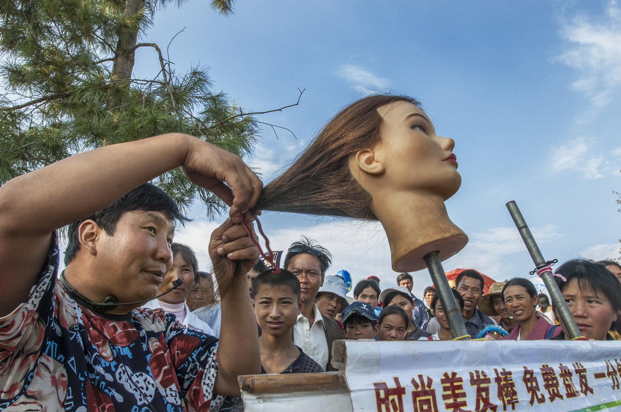 2006年,石林县石林镇赶街天,推销商品的小贩以盘发演示吸引乡亲们的围观。刘建明摄