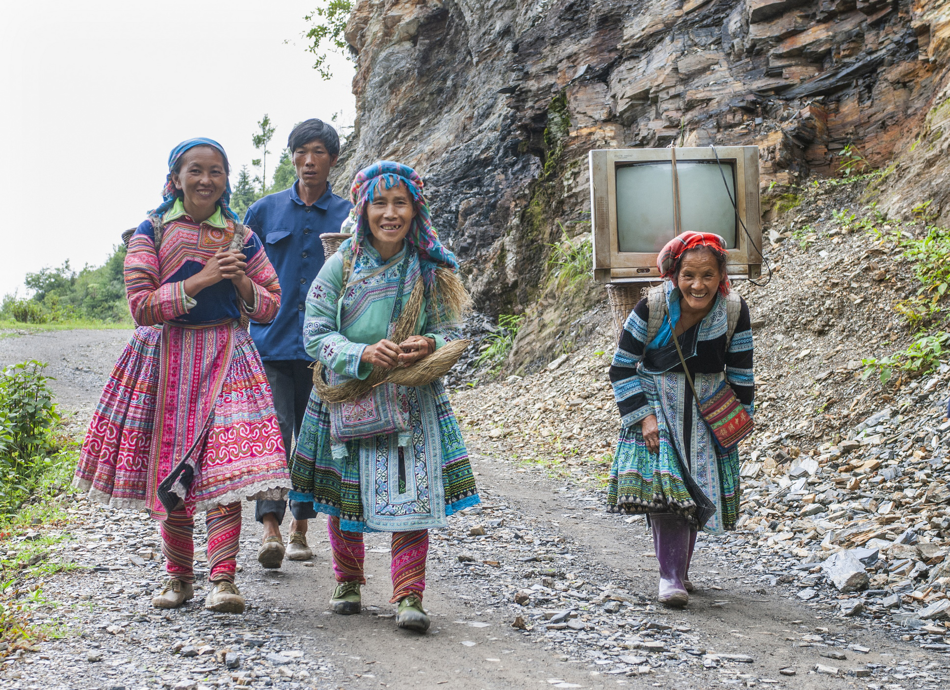 2008年, 西畴县柏林乡,在赶街天买到二手电视机后欣然返家的苗族老乡。刘建明摄