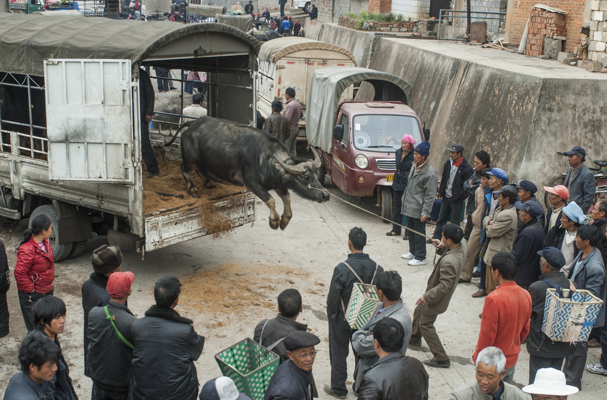 2011年,师宗县大同镇集市的大牲畜市场上,老乡们围观汽车拉来的水牛。刘建明摄