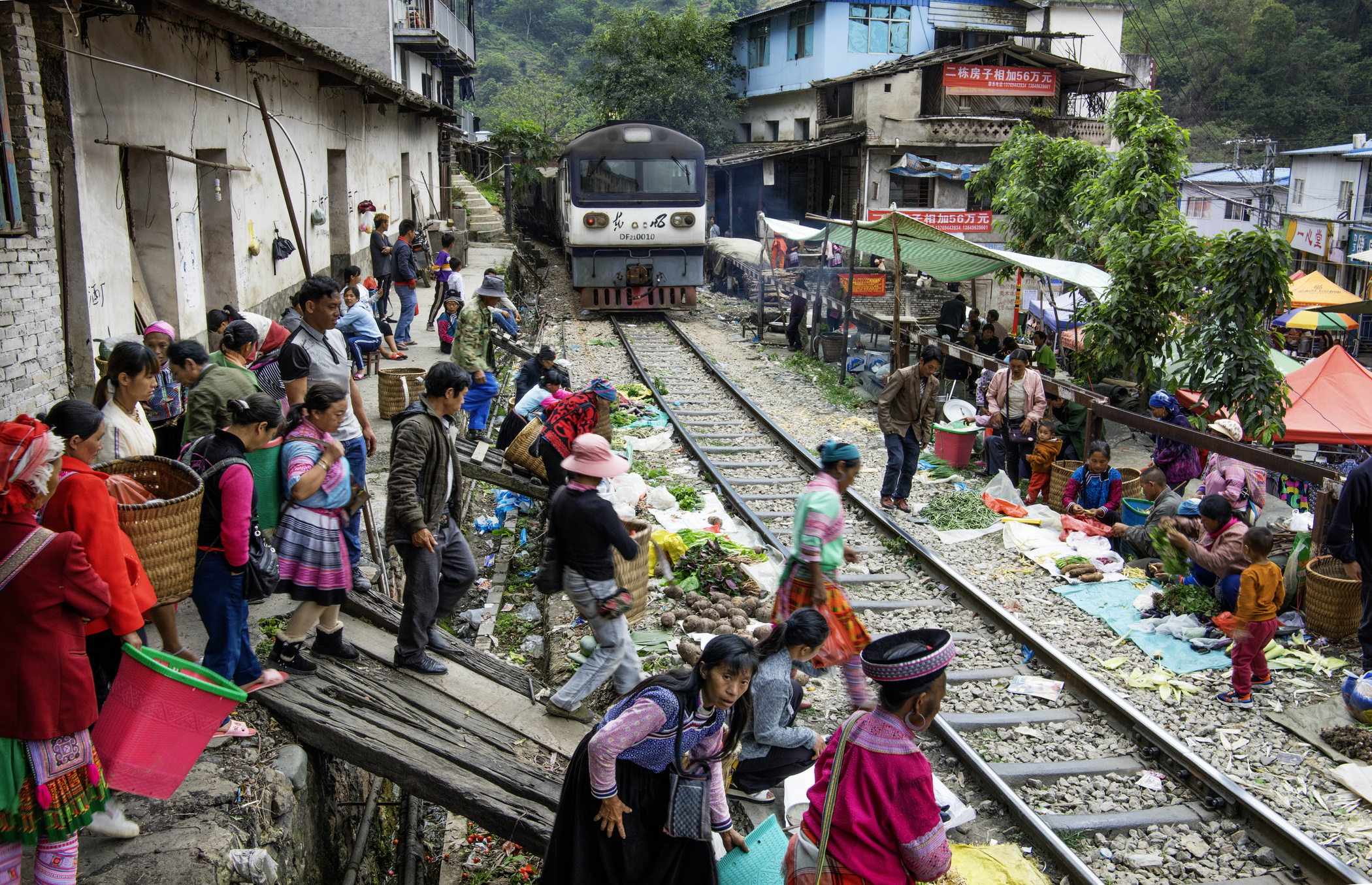2019年,屏边县白河桥集市被称为〝米轨集市〞。每逢赶街天,当地老百姓的农副产品交易全在滇越铁路的米轨两旁进行。刘建明摄