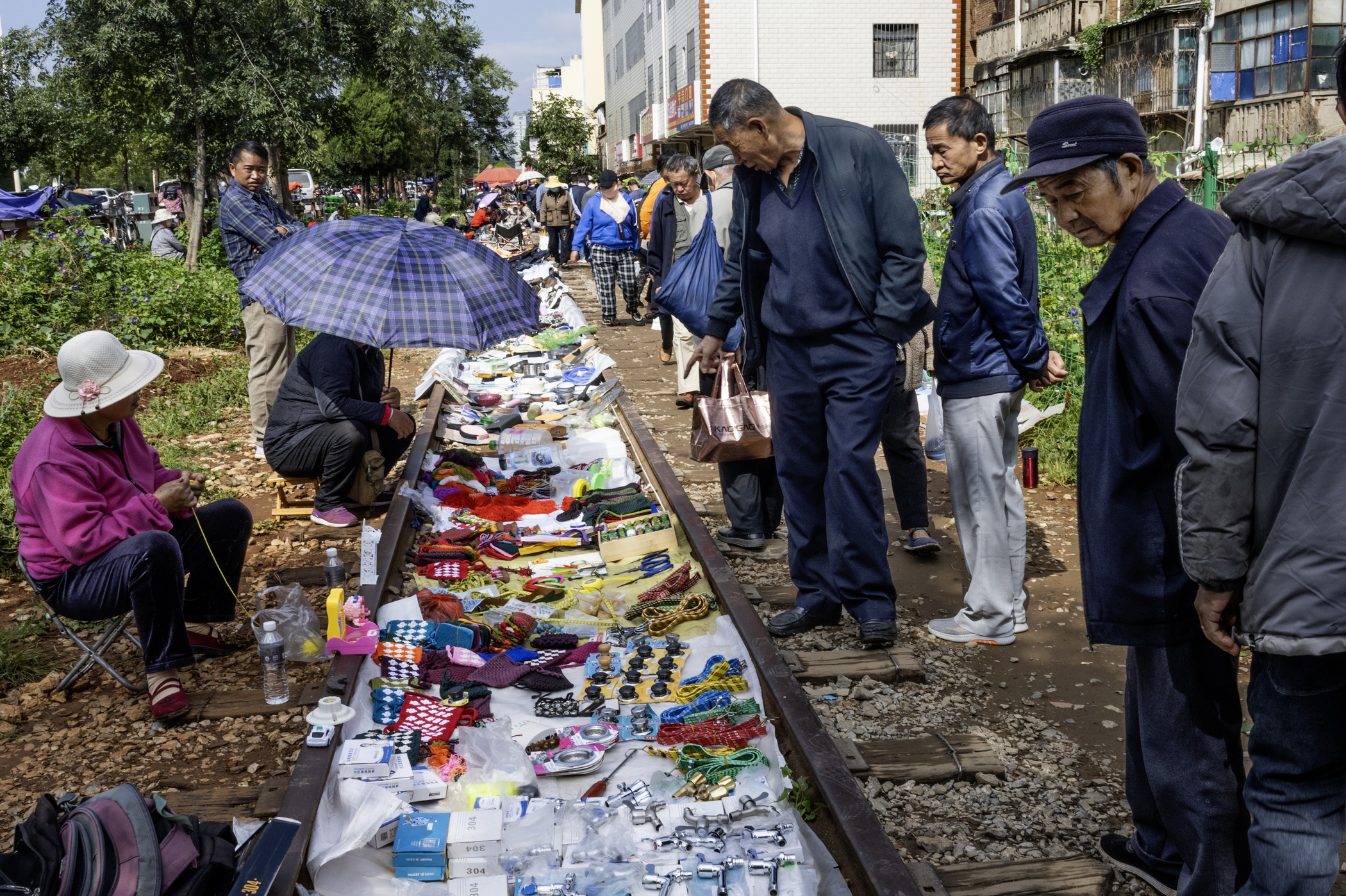 2023年,穿过昆明马街的米轨铁路早已停运。如今每逢星期天,路轨间就成了顾客云集的跳蚤市场。刘建明摄